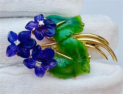 č. 181 342 14K BROŽ - FIALKA S NEFRITY, AMETYSTY A DIAMANTY