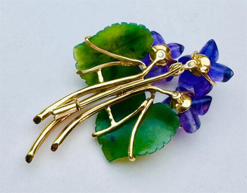 4K BROŽ - FIALKA S NEFRITY, AMETYSTY A DIAMANTY, brož je vyrobená z 14 K zlata a váží 10,5 gramů. Rozměr 48x30 mm. Nefritové lístky a ametystové květy byli před fasováním extra leštěné a vypadají naprosto fantasticky. Brož je v perfektním stavu a jde samozřejmě okamžitě i nosit, velmi žádaný sběratelský motiv broží.