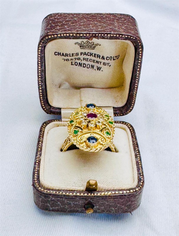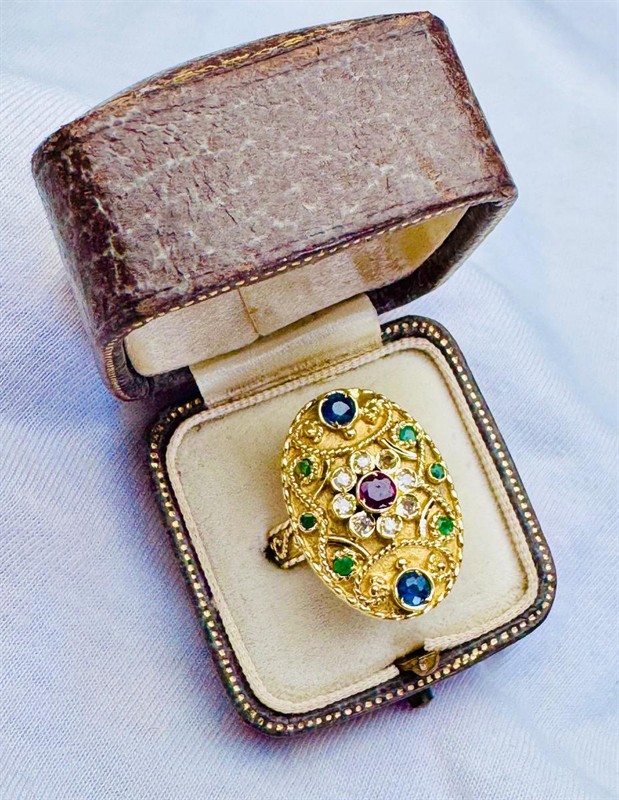 18K ZLATÝ PRSTEN S PŘÍRODNÍM DRAHOKAMY A DIAMANTY V ETUI - 7,3 GRAMŮ, prsten je vyrobený z 18K zlata a váží 7,3 gramů. Přírodní rubín, safíry, smaragdy a diamanty o celkové váze 0,87 ct.. Prsten má velikost 53. Součástí prstenu je dobová etue.