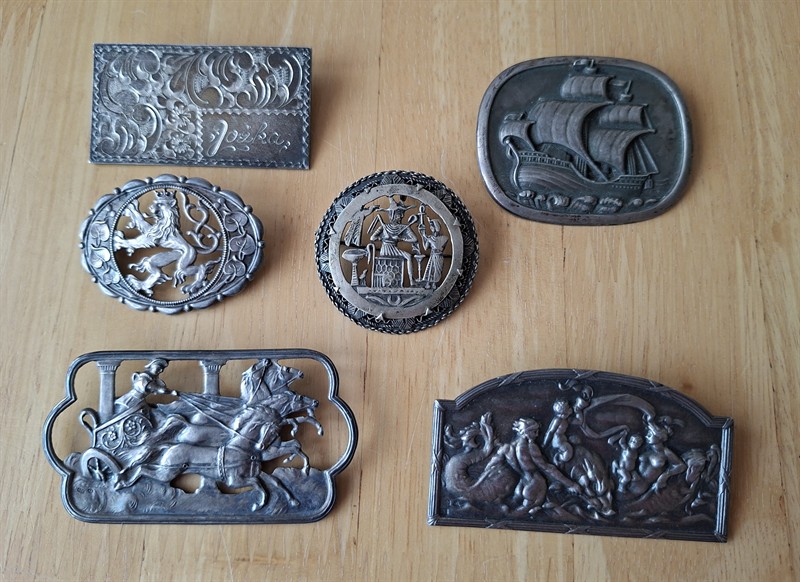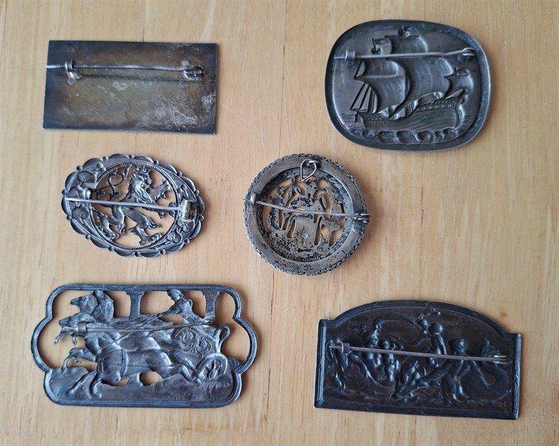 6 ks Brož stříbro, ryzost 800/1000 a 900/1000, vše puncováno, váha celkem 63,78 gramů, nečištěný nepoškozený pěkný stav viz foto.