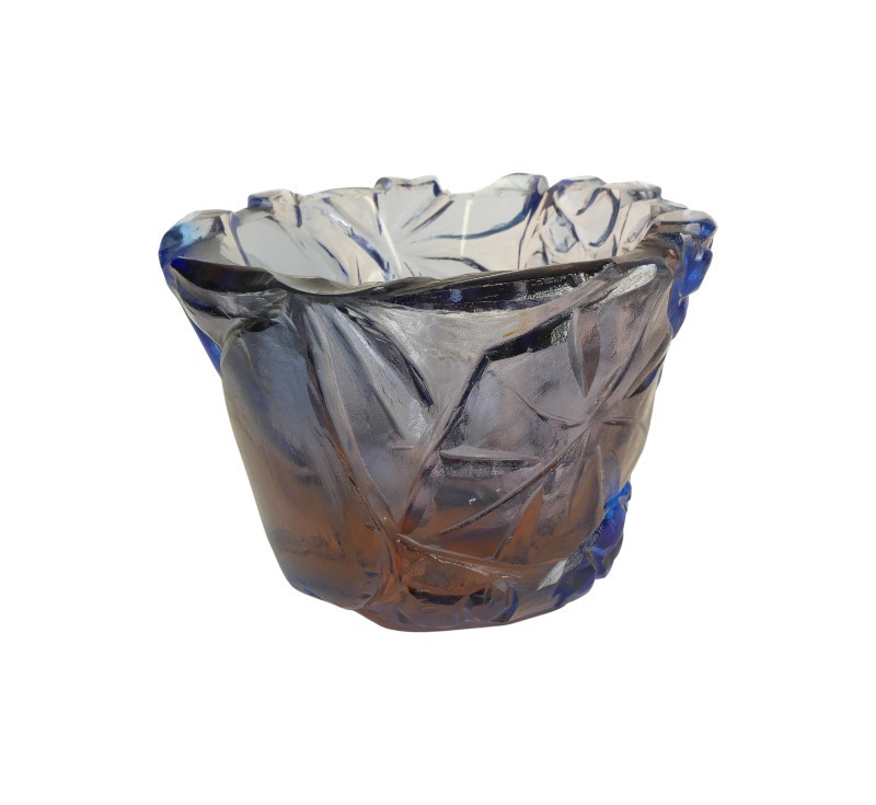 Sklo čiré, přejímané sklem fialové (modrooranžové) s řezaným dekorem ovoce, broušeno, výška 12,5 cm, horní průměr 17,9 cm. Práce z druhé poloviny 40. let. Z brusičské Školy v Kamenickém Šenově. Váza signována Drobník.