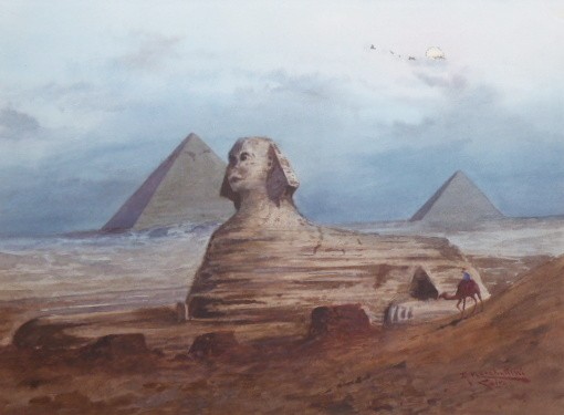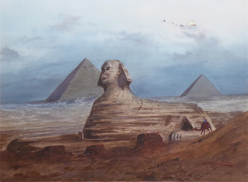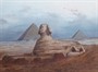 Akvarel a kvaš na papíru 31 cm x 44 cm. Signováno vpravo dole a nápis Cairo (Káhira). Velká sfinga v Gíze spolu s pyramidami zachycená před více jak sto lety. Ve zlaceném rámu dekorovaném reliéfními florálními ornamenty, s paspartou a sklem. Egypt, Káhira 1890 - 1920. Celkový rozměr s rámem 48 cm x 61 cm.