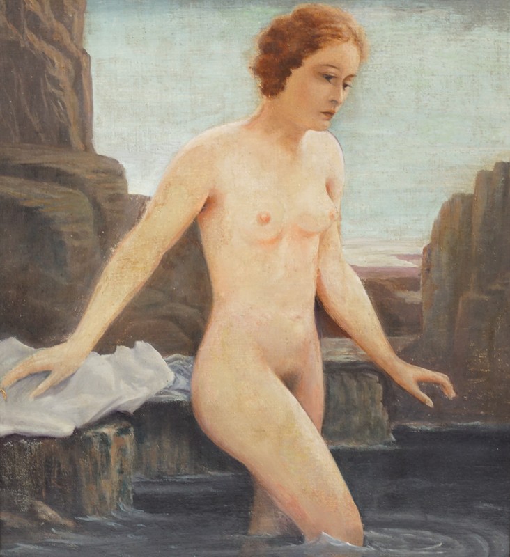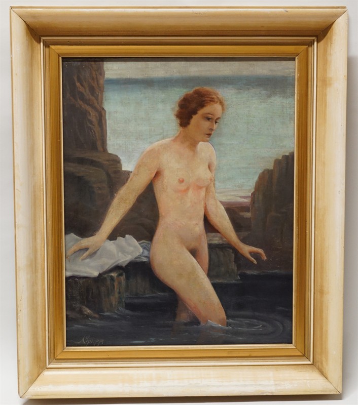 Olejomalba na na desce z první poloviny minulého století v původním masivním rámu. Mladá dívka při koupeli v laguně u mořského pobřeží. Autorem nečitelně signováno l.d. (viz posl. foto). Smyslný a velmi estetický akt, dobové zobrazení nahého ženského těla. Dobrý stav, celkový rozměr 66 x 56cm, rozměr díla 49 x 39cm