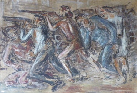 Olej na kartonu 49 cm x 71 cm. Signováno vpravo dole. Aloys Wach ? (1892-1940). Bitevní řež v ulicích města na jedné z barikád. Ve zlaceném profilovaném rámu se sklem. Rakousko 1930 - 1940. Celkový rozměr s rámem 61 cm x 83 cm.