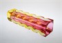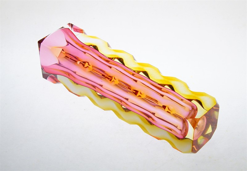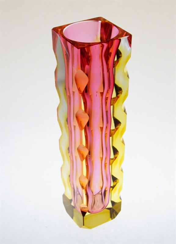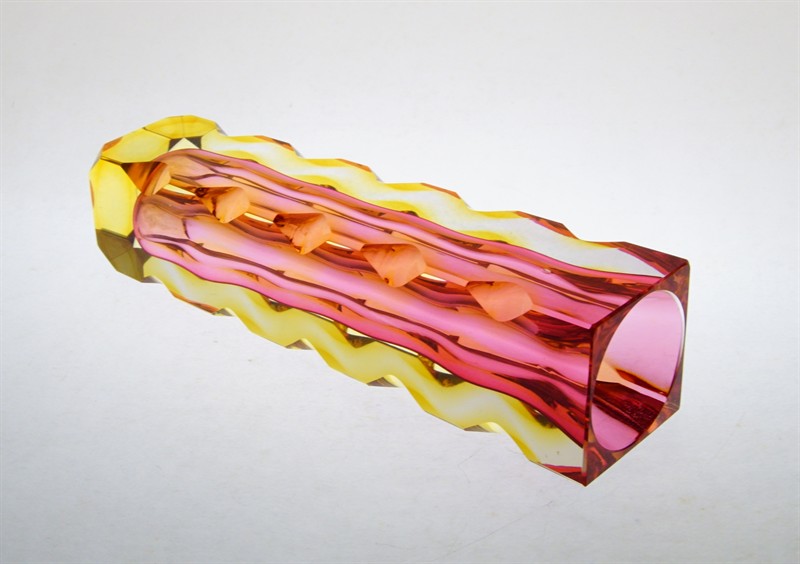 Celoplošně broušená a leštěná váza na jednu květinu - rubínové jádro je přejímané sklem v odstínu Amber. Novoborští skláři ji v hantýrce říkali "Kudrnačka". Autorem návrhu z roku 1964 je pedagog, sochař a sklářský výtvarník Oldřich LIPSKÝ (*1922 +1987). Provedla sklárna EXBOR Nový Bor. Dobrý stav, rozměr v. 21,5 x 5,5 x 5,5cm