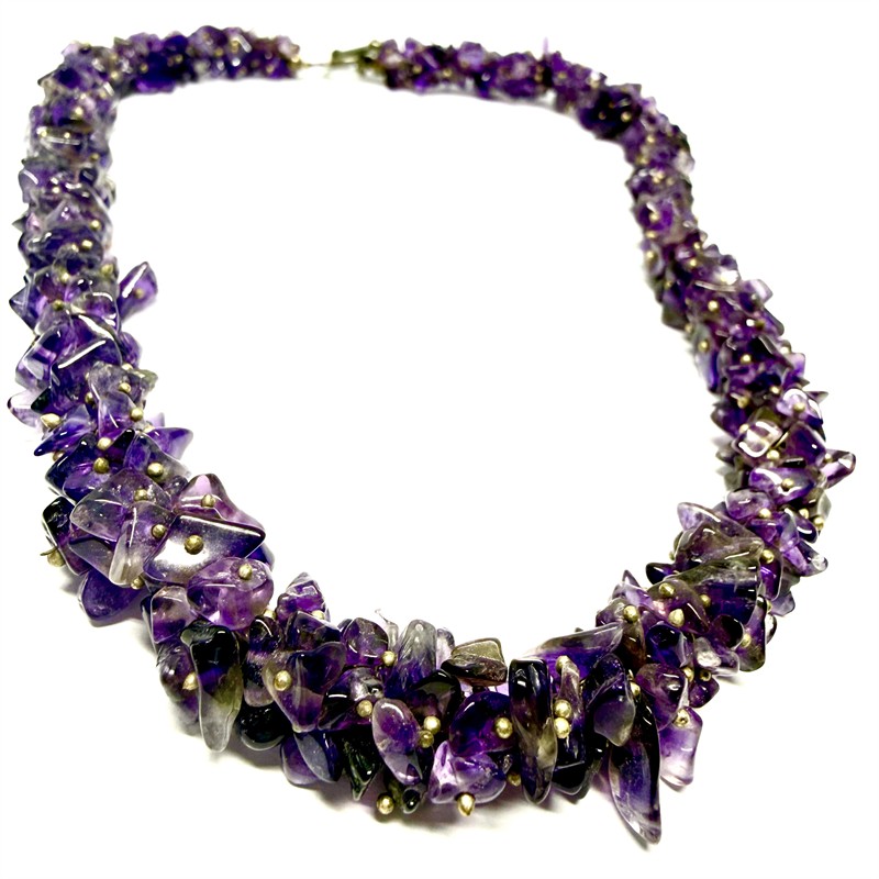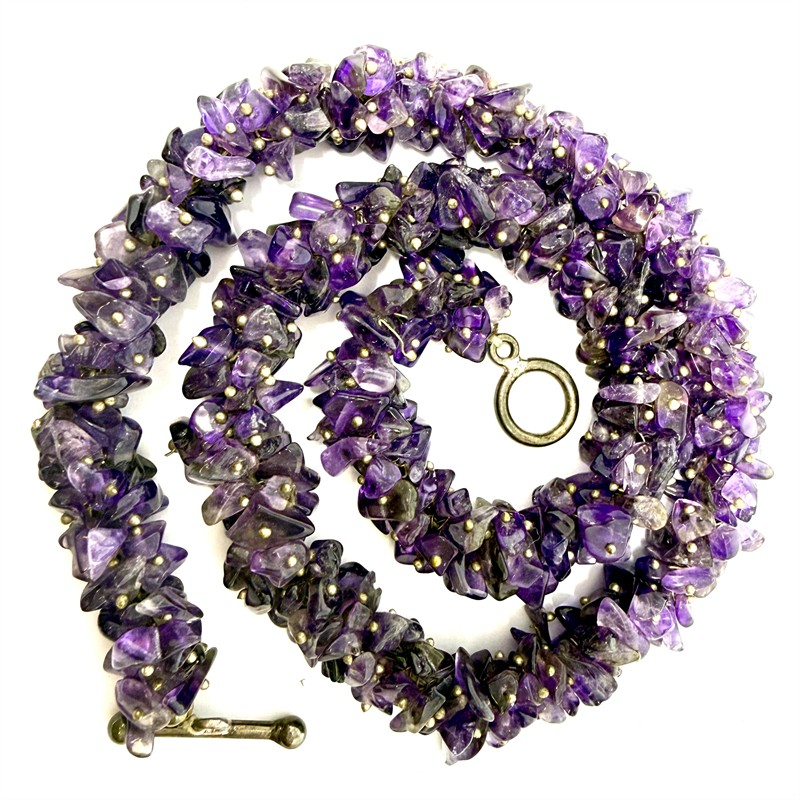 Velmi půvabný náhrdelník zhotovený ze stovek drobných, přírodních ametystů. Délka 47 cm, šířka cca 1 cm. Náhrdelník je ukončen minimalistickým zapínáním ze sterlingového stříbra (925/1000). Celková váha 64,40 g. Výborný stav.