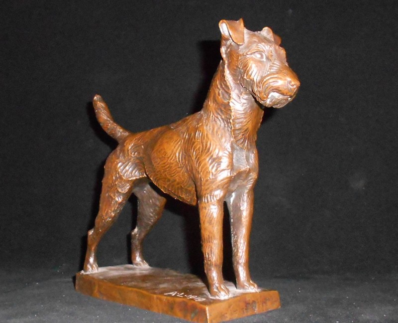 ANTONÍN LHOTÁK - PES, 1919 Bronz, výška 19 cm, základna 16 x 7 cm. Signováno A.L.1919. Autor Antonín Lhoták nar. 1897, žák Drahoňovského a Španiela. Významný český sochař, zastoupen v NG Praha a jinde. Snad nejvýznamnější dílo je třímetrový pomník Alšův v Miroticích.