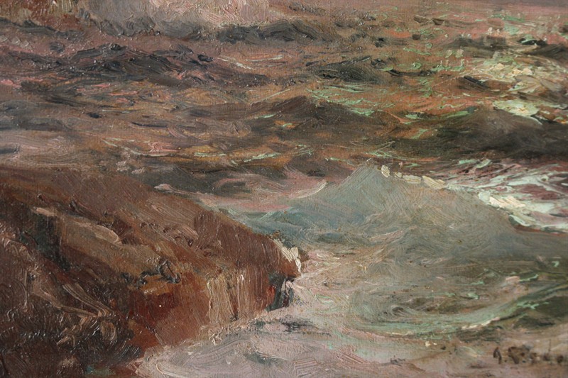 olej/karton, rozměr 25 x 35 cm,Plus ram, značeno vpravo dole, rámováno. oAutoři Arsenij Petrovič Sosnovskij Narodil se 20. 8. 1895 v Kyjevě a zemřel 23. 3. 1967 v Lyusechil ve Švédsku. Byl synem ředitele školy. V roce 1912 se zapsal na univerzitu v Kyjevě, kde studoval historii a filozofii. V roce 1914 se dobrovolně přihlásil na frontu, bojoval v hodnosti poručíka na lodi Orkan. Ve 20. letech 20. století pobýval v Černé Hoře, kde se učil malovat na střední škole v Cetinje. Později se usadil se svou ženou v Bělehradě. Maloval převážně pohledy na moře. Společně se svou manželkou vystavoval v Záhřebu, Praze, Paříži a Bruselu. Účastnil se též skupinových výstav v Bělehradě a Florencii. V 50. letech byl vyhnán do Bulharska, potom odešel do Turecka, později do Terstu. V roce 1954 odešel s manželkou za příbuznými do Švédska. Usadil se v Lyusechil u Goteborgu, kde pokračoval v malování. Jeho díla jsou umístěna v námořním muzeu v Kotoru, v paláci krále Mikuláše v Cetinje, v galeriích v Záhřeb