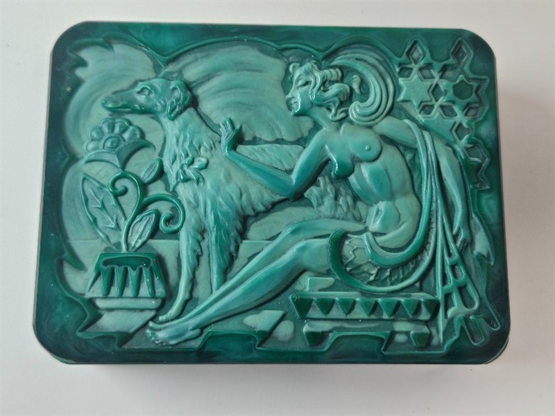 Velmi vzacna malachitova doza od firmy Ingrid Cechoslovakia rok 1920. Doza je v dobrem stavu, bez poskozeni, rozmery 12cm x 9cm x 4cm.