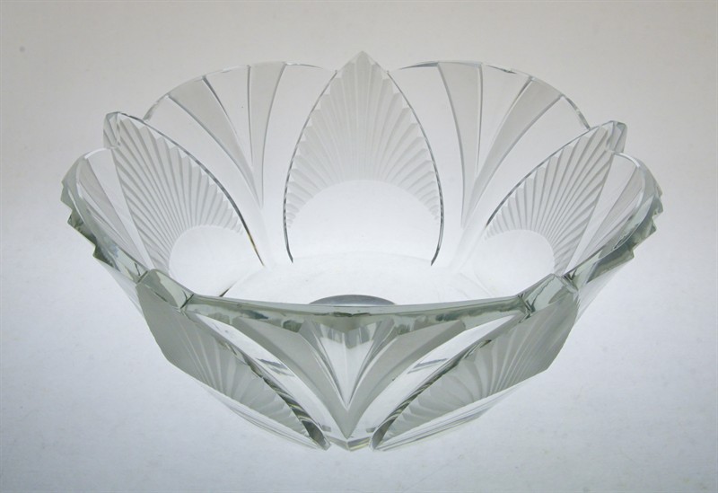 Luxusní a velké provedení broušené mísy z čirého skla ve tvarosloví ART - DECO v podobě široce otevřeného květu se stylovým a bohatým dekorem. Okraj mísy je broušený do vlnek a špiček s částečně matovaným brusem (tzv. Mattschliff). Provedla umělecká krystalerie Rudolf HLOUŠEK Železný Brod ve 30-40tých letech. Dobrý stav, rozměr - prům. 27cm, v. 11cm, hmot. 2,8kg