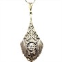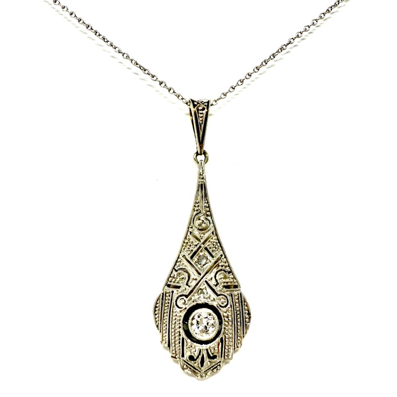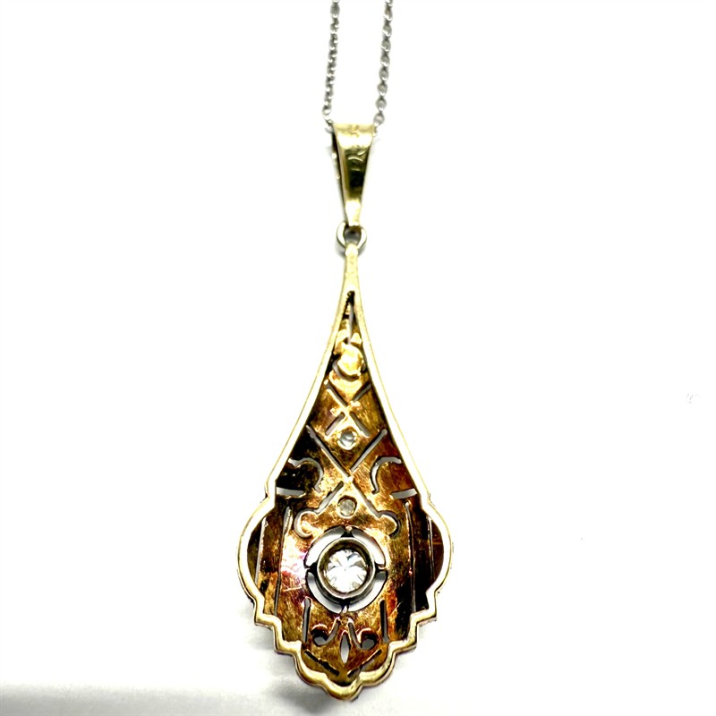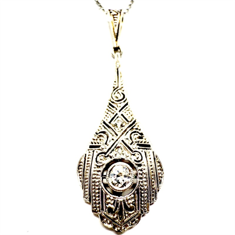 Jemný náhrdelník zhotovený v první polovině 20.století ve stylu Art deco. Šperk zdobí odnímatelný závěs zhotovený v kombinaci 14ti karátového zlata (585/1000) a platiny (950/1000). Závěs je jemně prořezáván, zdobí jej briliant starého brusu o celkové váze cca 0,15 ct a dvě diamantové routy. Řetízek, stříbro ryzosti 800/1000, zapínání s pojistkou ze zlata 585/1000. Celková váha 3,14 g. Délka řetízku 39 cm. Délka závěsu 3,7 cm. Ke šperku je zhotoveno osvědčení Puncovního úřadu. Starý, autentický šperk v perfektním stavu.