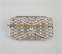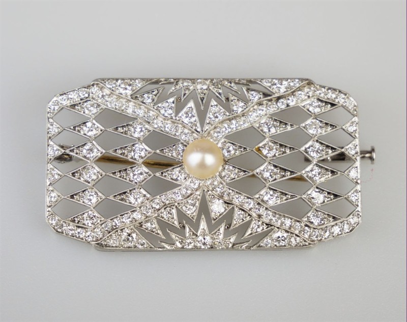 art deco platinová brož s 98 diamanty briliantového brusu velmi dobré kvality o celkové hmotnosti cca 2,15 ct a 1 kultivovanou perlou o průměru 6 mm, Pt+Au 12,88 g/950+750/1000 (zlatá jehla); střední Evropa, kolem r. 1930; rozměry 4,8 x 2,7 cm; atest puncovního úřadu, znalecký posudek