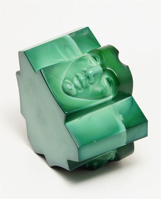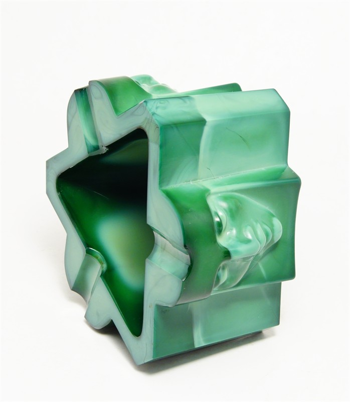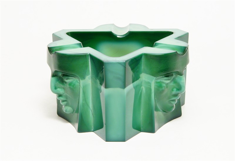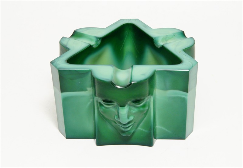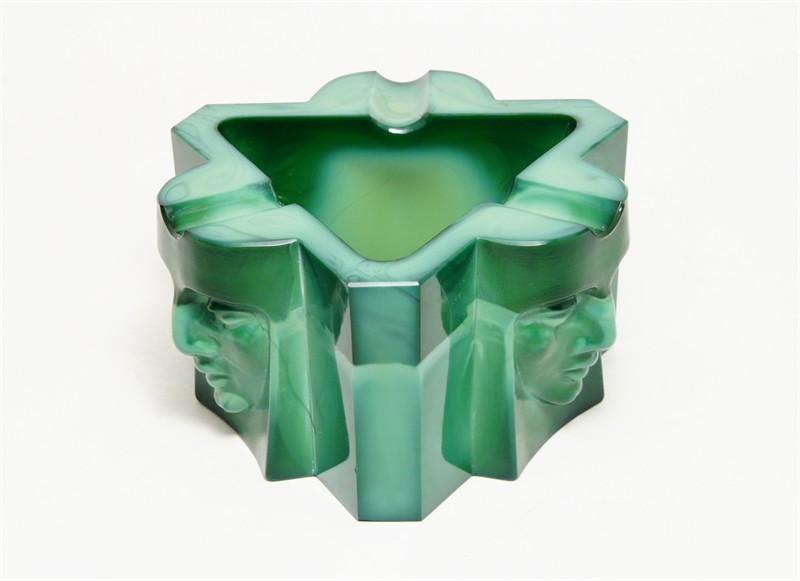 Art - Deco popelník z malachitového skla, které má krásnou malbu žíhání, částečně matovaného a broušeného s hlubokým reliéfem třech mužských tváří. Velmi působivý doplněk z masivního skla "Jade", provedla firma Curt SCHLEVOGT jako součást kolekce luxusního skla INGRID po roce 1930, dobrý stav, rozměr - v. 6 x 11 x 11cm