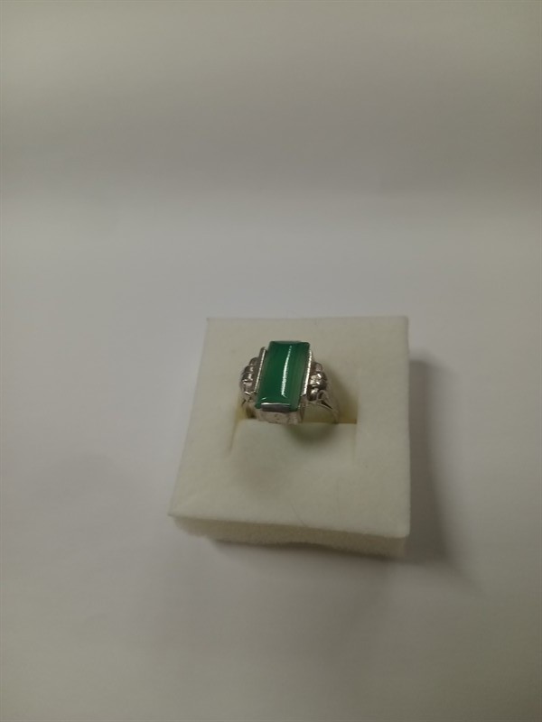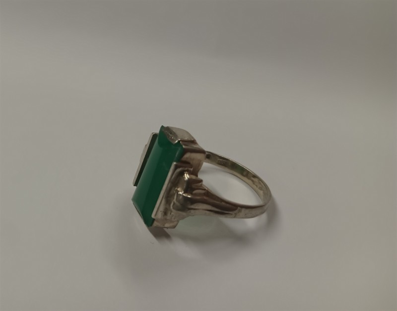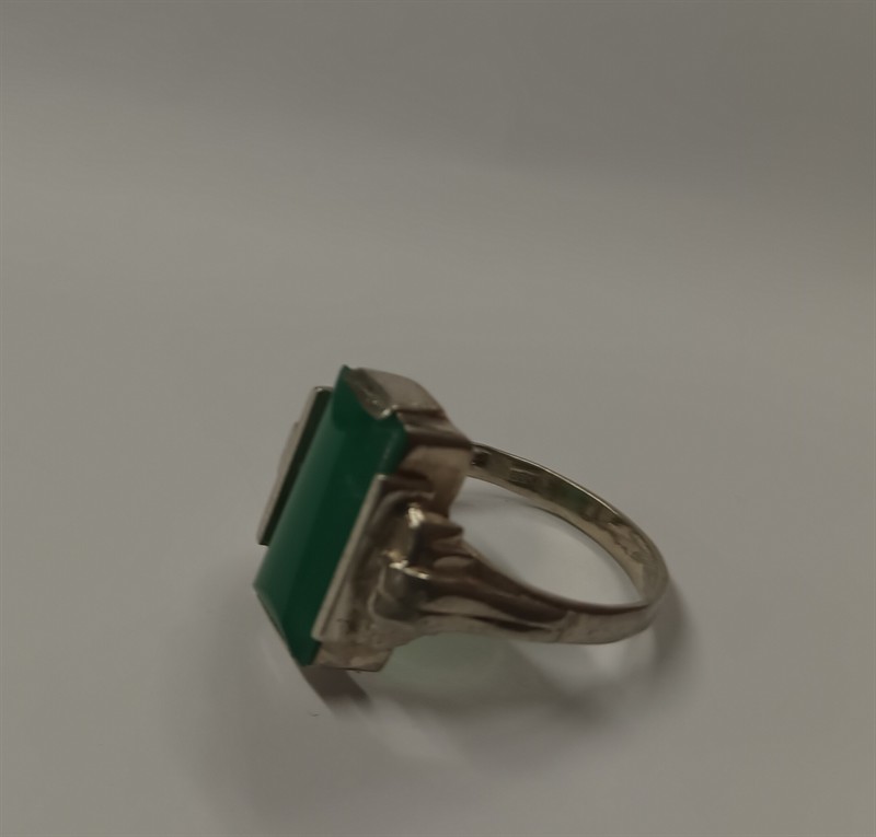 Art deco prsten vyrobený ze stříbra ryzosti 835/1000, s centrálním zeleným kamenem . Velikost prstenu je 57 . Hmotnost 3,9 gr.