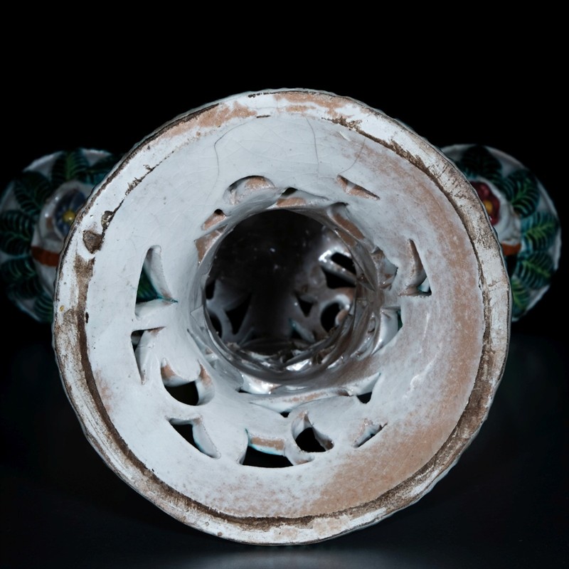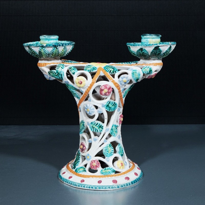kolem r. 1930, autorská práce, neznačeno, výška 23 cm, barevně dekorovaná prolamovaná keramika. Pozn.: Keramická dílna Il Laboratorio Ceramico Lapucci byla založena v r. 1922 v Monte San Savino.