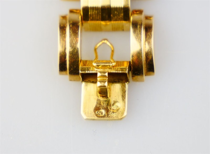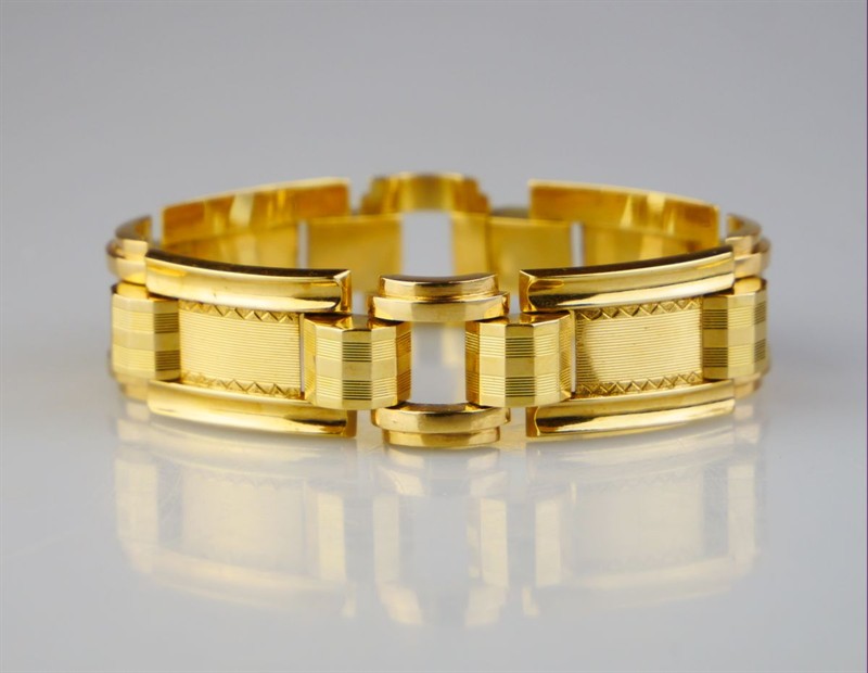 art deco zlatý článkový náramek zdobený gilošováním, Au 27,29 g/585/1000, Československo, kolem r. 1930, dobový punc (lvíček); délka 17,5 cm, šířka 1,8 cm