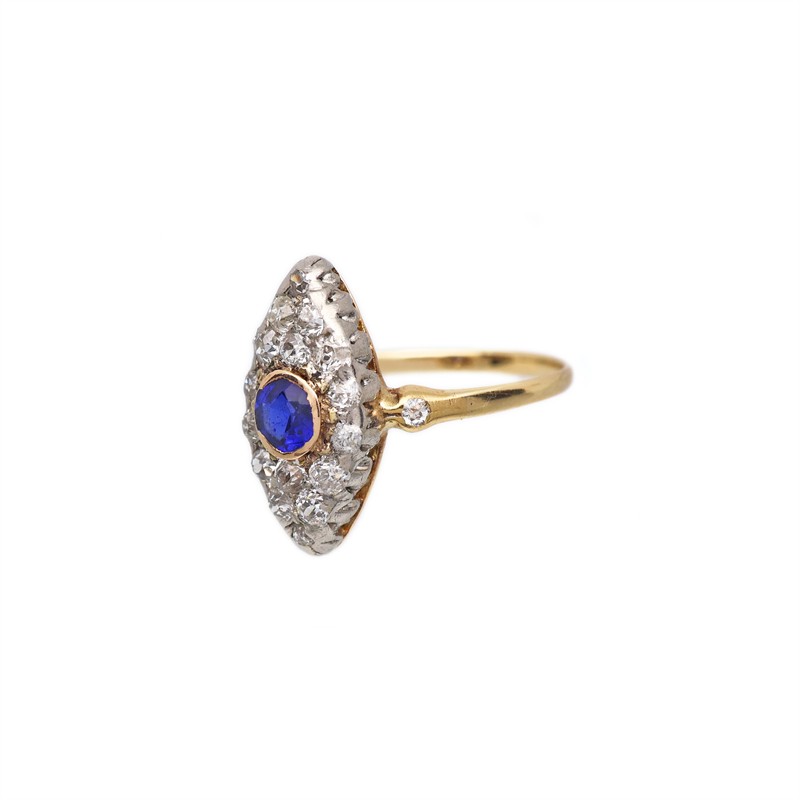 14 karátové zlato 580/1000, celková hmotnost 2,35 g | Přírodní diamanty 0,50 ct | Přírodní safír | Období Art deco | Rok 1930 | Velmi dobrý stav | Krásná stará práce | Velikost prstenu 49 (lze upravit) | Velikost hlavy 1,7 x 0,8 cm | Kameny zkontrolovány v gemologické laboratoři.