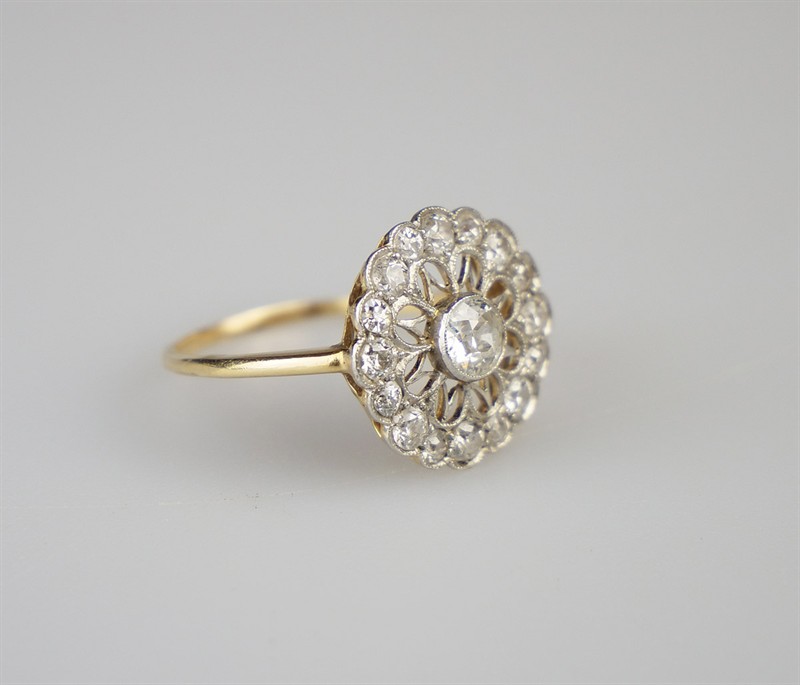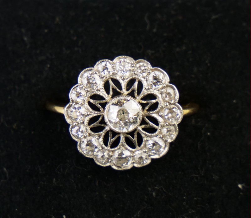 art deco zlatý prsten se 17 diamanty briliantového brusu o hmotnosti cca 1,2 ct, z toho centrální diamant o hmotnosti cca 0,35 ct, kameny v krajkově řešené hlavě zasazené v platině, Au+Pt btto 3,03 g/720+950/1000, západní Evropa, kolem r. 1935; atest Puncovního úřadu; velikost prstenu 59