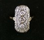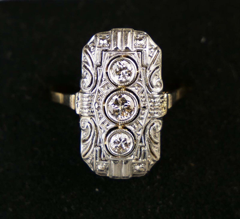 art deco zlatý prsten s diamanty briliantového brusu o celkové hmotnosti cca 0,55 ct, kameny zasazené v platině, Au+Pt 2,80 g/585+950/1000, střední Evropa, kolem r. 1935, rozměry hlavy 1,4 x 2,2 cm; atest Puncovního úřadu; velikost prstenu 61
