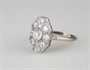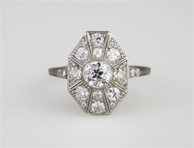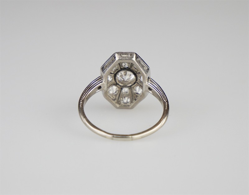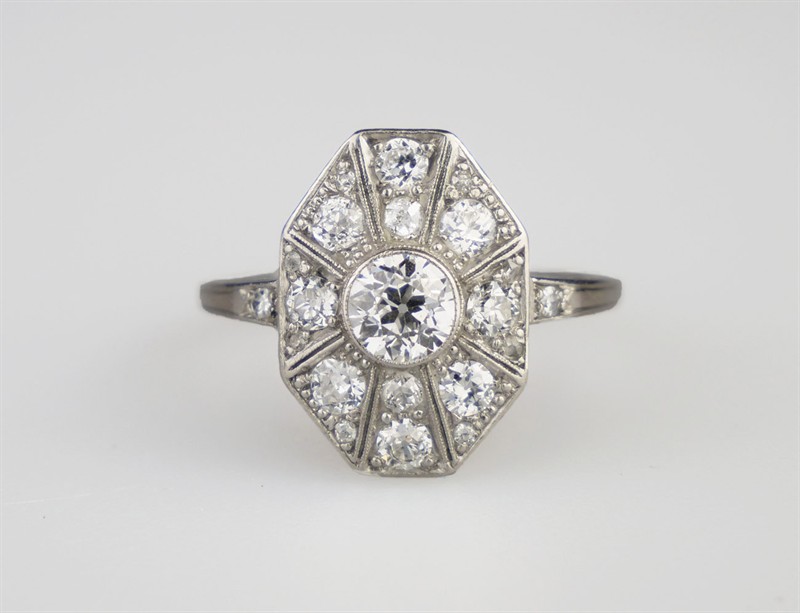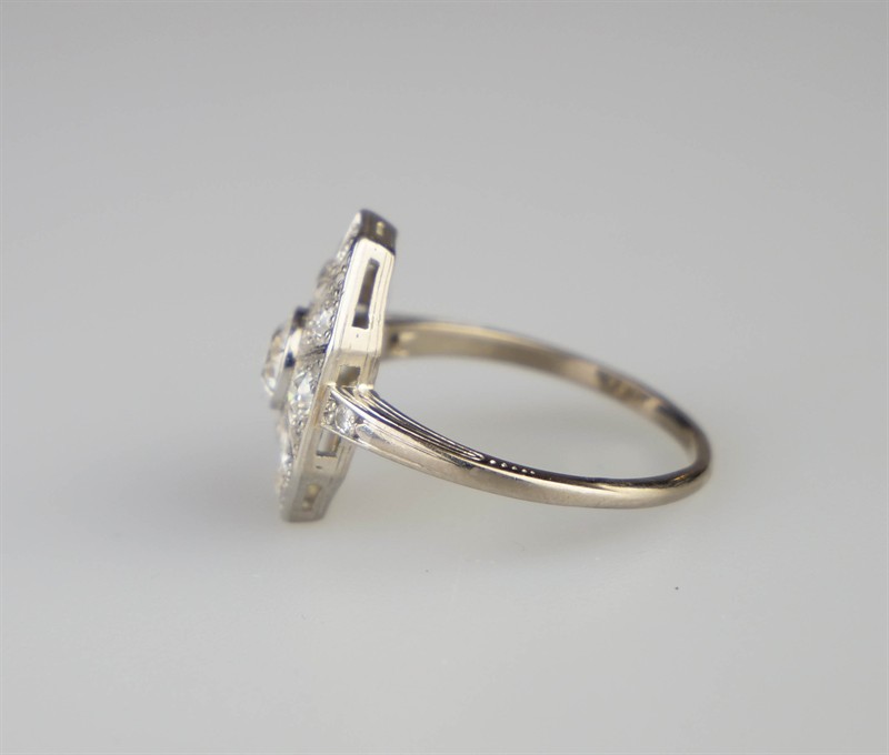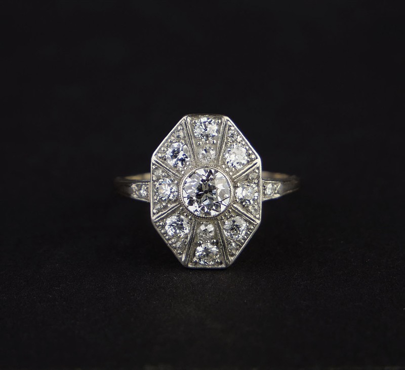 mistrovský zlatý prsten s diamanty – precizní práce spojující eleganci, tradici a řemeslnou dokonalost. 19 ks diamantů starého briliantového brusu o celkové hmotnosti 1,44 ct velmi dobré kvality, VS1 – VS2, barva G – H, centrální diamant o hmotnosti 0,55 ct, VS1, G -H. Celková hmotnost Au 4,55 g/750/1000, osvědčení Puncovního úřadu. Západní Evropa, 30. léta 20. století, velikost prstenu 59