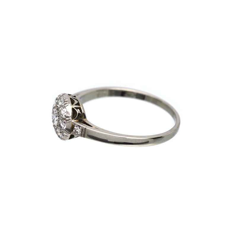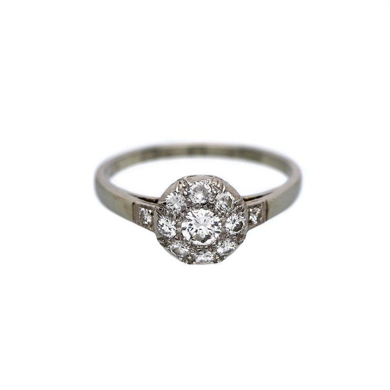 14 karátové bílé zlato 585/1000, celková hmotnost 2,46 g | Přírodní diamanty briliantového brusu celkem 0,46 ct | Období Art deco | Krásná práce | Výborný stav | Velikost prstenu 56 (lze upravit) | PŘILOŽEN CERTIFIKÁT PRAVOSTI