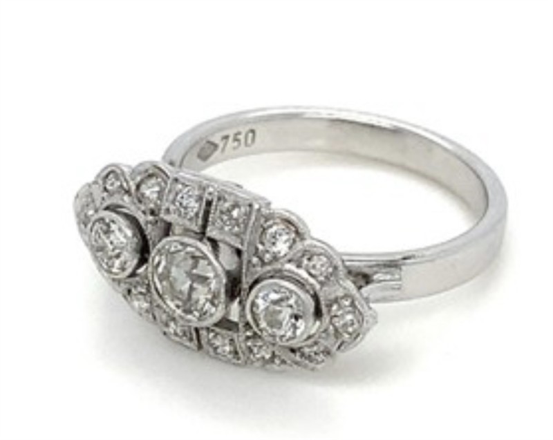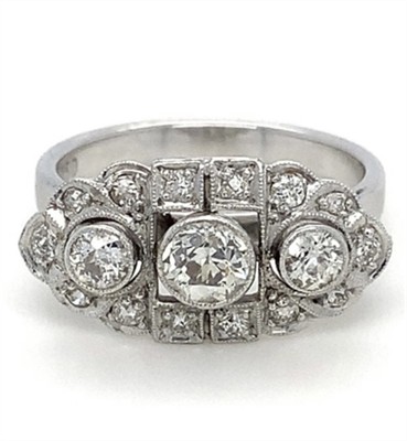 Starožitný ArtDeco prsten z bílého zlata s brilianty ,Au 750/585/1000, hmotnost 5,40g, velikost 57, diamanty o celkové váze cca 1.00 ct., atest punc.úřadu, Krásná Prvorepubliková práce, Odborně vyčištěno zlatníkem