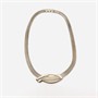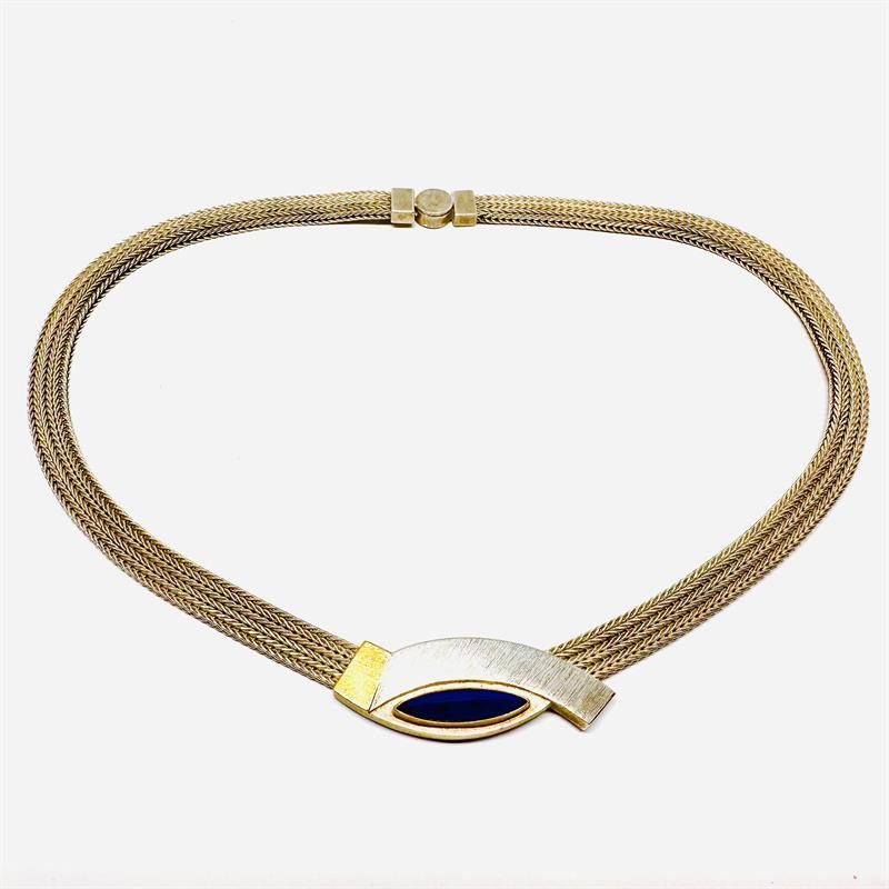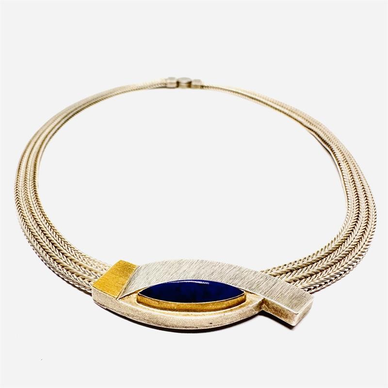 Originální, autorský náhrdelník. Jeho dominantou je pohyblivý jezdec osazený výrazně modrým lápisem lazuli. Kámen je zasazen v téměř ryzím zlatě (Au 986/1000), stejně jako jeho zlatem zdobená část. Šperk byl vyroben ze stříbra ryzosti 925/1000, celkové hmotnost 50,85. Rafinované zapínání. Povrch šperku jemně matován. Ateliérová značka. Autorský, originální šperk v perfektním stavu.