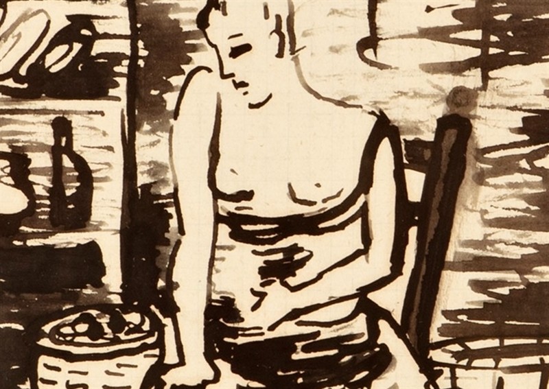 Kresba tuší na kartonu o velikosti 20 x 14 cm ve výřezu pasparty, pozůstalostní razítko s č.5 soupisu. Rámováno v paspartě pod sklem. Bedřich Piskač (1898 -1929), byl český akademický malíř, člen SVU Mánes. V letech 1917–1924 studoval na Akademii výtvarných umění v Praze u profesorů Nechleby, Krattnera a Španiela. Vystavoval s Devětsilem, Novou skupinou, v Mánesu, Rudolfinu. Zastoupen je ve sbírkách Orlické galerie v Rychnově nad Kněžnou, Národní galerie Praha, Galerie hlavního města Prahy, Krajské galerie výtvarného umění ve Zlíně a Selicharově obrazárně v Rybné nad Zdobnicí.