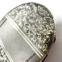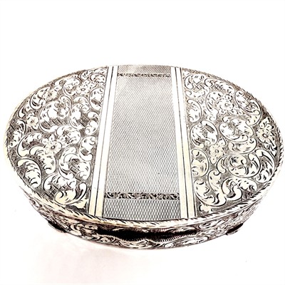 Elegantní, oválná krabička z první republiky. Artefakt byl zhotoven z masivního stříbra ryzosti 900/1000 a zdobí jej mistrné, hluboké rytí s florálním motivem. Střed je kontrastně zdoben pruhem s gilošováním. Značeno ryzostní, mistrovskou a původní puncovní značkou. Váha 90,90 g. Rozměry cca 8,5 x 6 cm. Uvnitř decentně pozlaceno. Na víčku nápis "Drahé babičce". Perfektní stav.