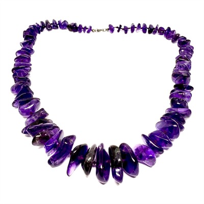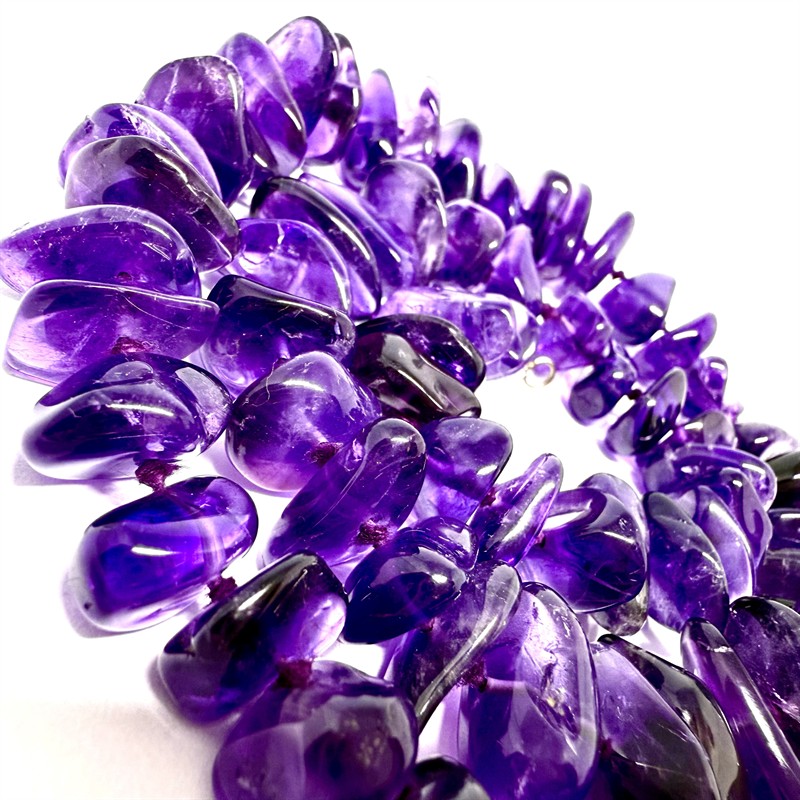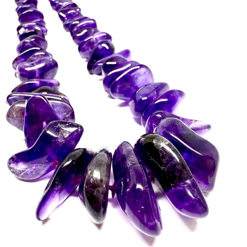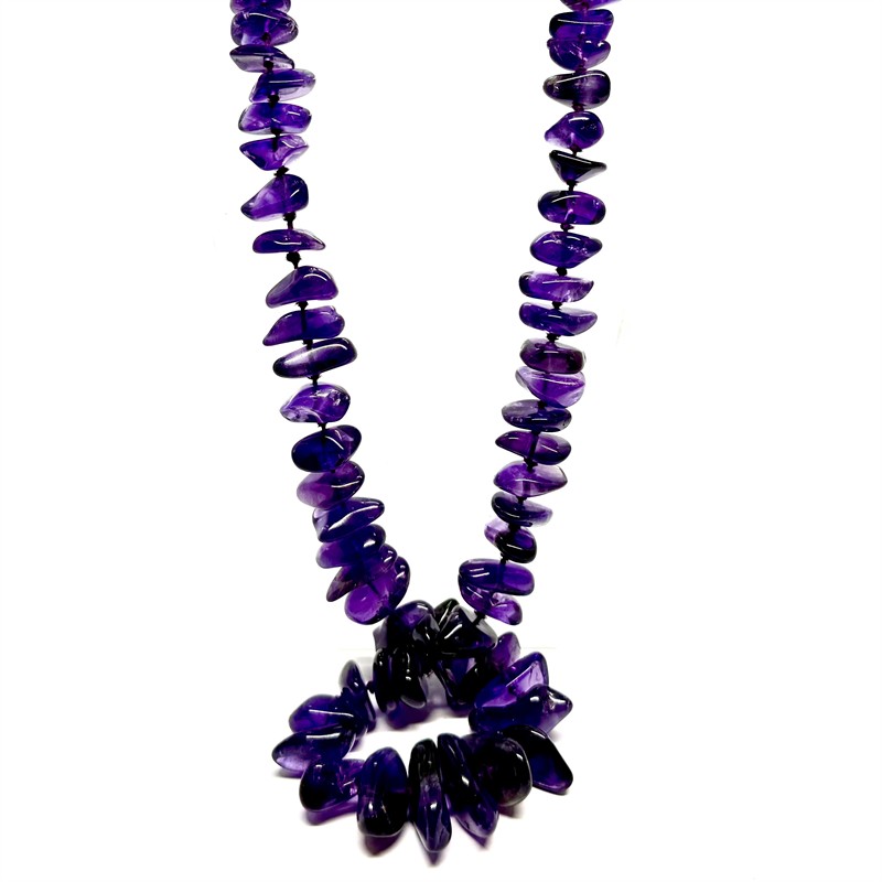 Bohatý náhrdelník z přírodních, sytě fialových ametystů. Každý z drahých kamenů je pečlivě prouzlíkován. Délka 65 cm. Perfektní stav.