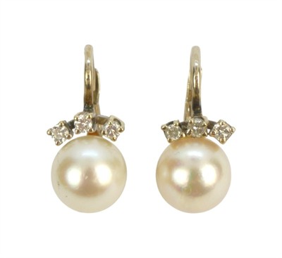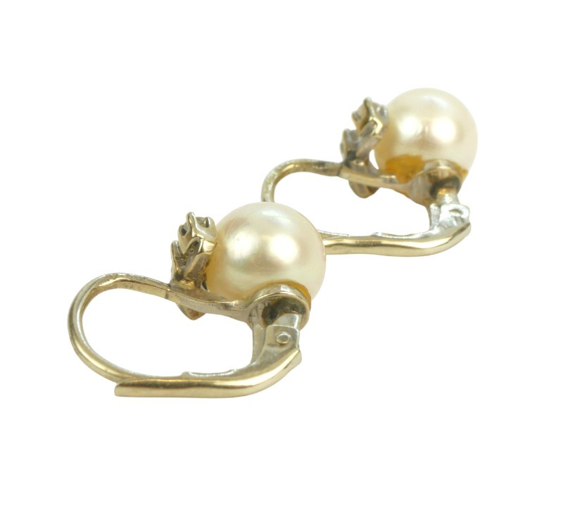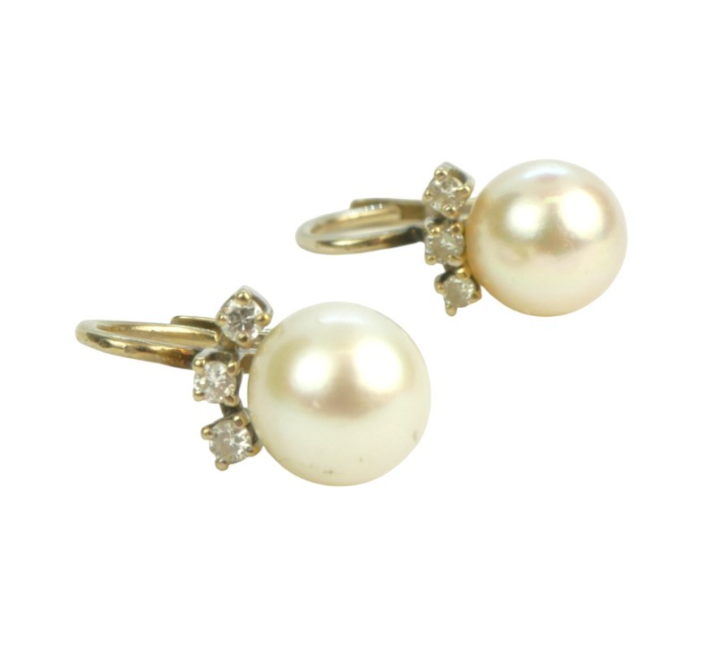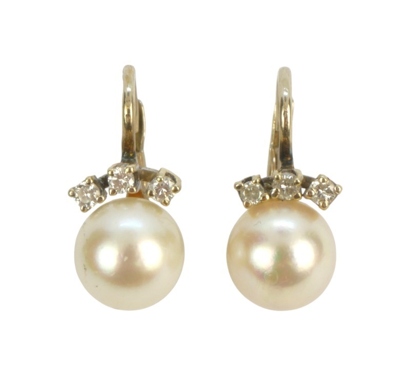 Briliantové náušnice s perlou, náušnice jsou osazeny perlou a drobnými briliantky 0,06 ct a jsou značeny puncovní značkou Z-59 pro staré zboží, nižší, než současné zákonné ryzosti au 333-584/1000 o celkové hmotnosti 3,14 g, délka náušnic cca 1,5 cm.