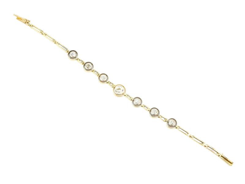Luxusní článkový náramek ze žlutého zlata o ryzosti 585/1000 zdobený diamanty o celkové hmotnosti cca 2 ct, středový kámen má hmotnost 0,75 ct. Délka náramku 18 cm, celková hmotnost 14,70 g.