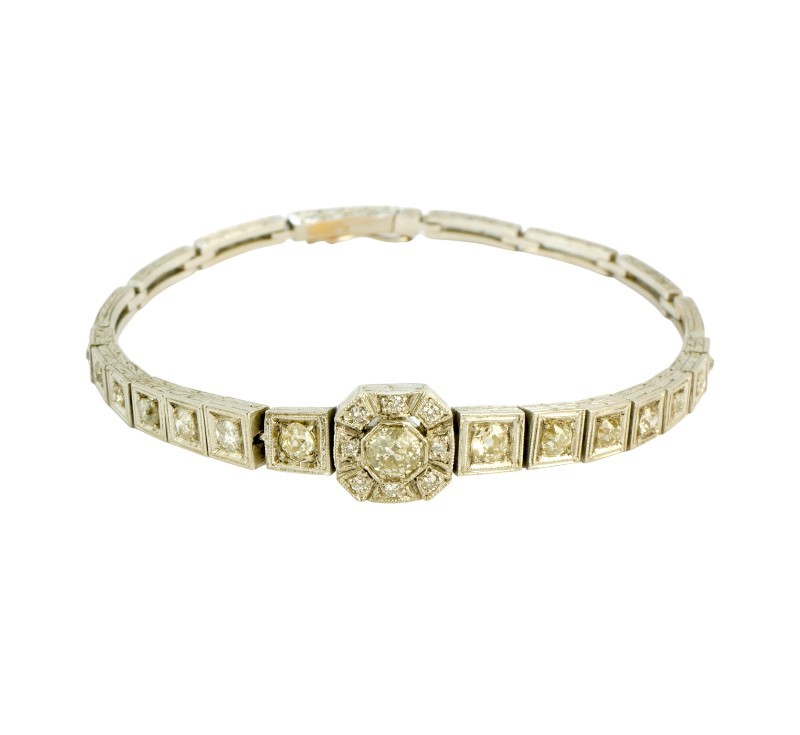 Luxusní briliantový náramek z počátku 20. století byl zhotoven v kombinaci bílého zlata ryzosti 230/1000 (4,20 g) a stříbra 900/1000 (8,46 g). Geometricky tvarované články s výraznějším centrálním středem jsou osazeny brilianty celkové hmotnosti cca 1 ct. Celková hmotnost náramku je 13,5 g, délka 18,2 cm. Zapínání je opatřeno pojistkou. Náramek může být reprezentativním darem nebo investičním kusem do sbírky starožitných šperků. K šperku je zpracováno Osvědčení Puncovního úřadu.