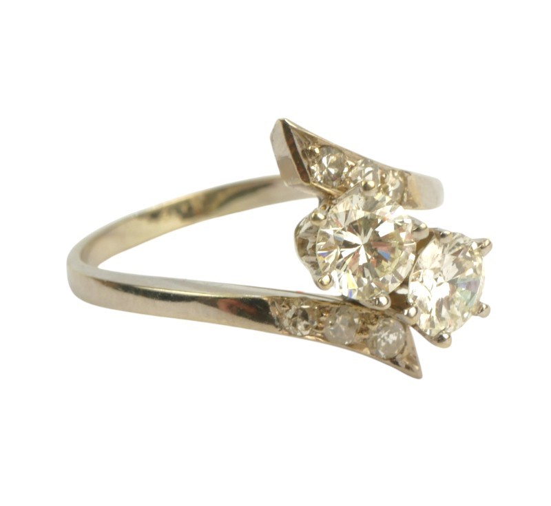 Zlatý prsten osazený dvěma přírodními diamanty brilantového brusu o celkové hmotnosti 0,80 ct, kameny jsou velmi dobré kvality VVS - VS, a šesti osmihrannými diamanty cca 0,12 ct, bílé zlato o ryzosti 18 karátů 750/1000 o celkové hmotnosti 3 g, velikost prstenu 53.
