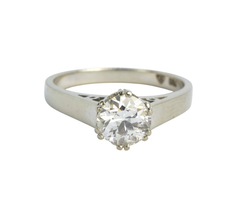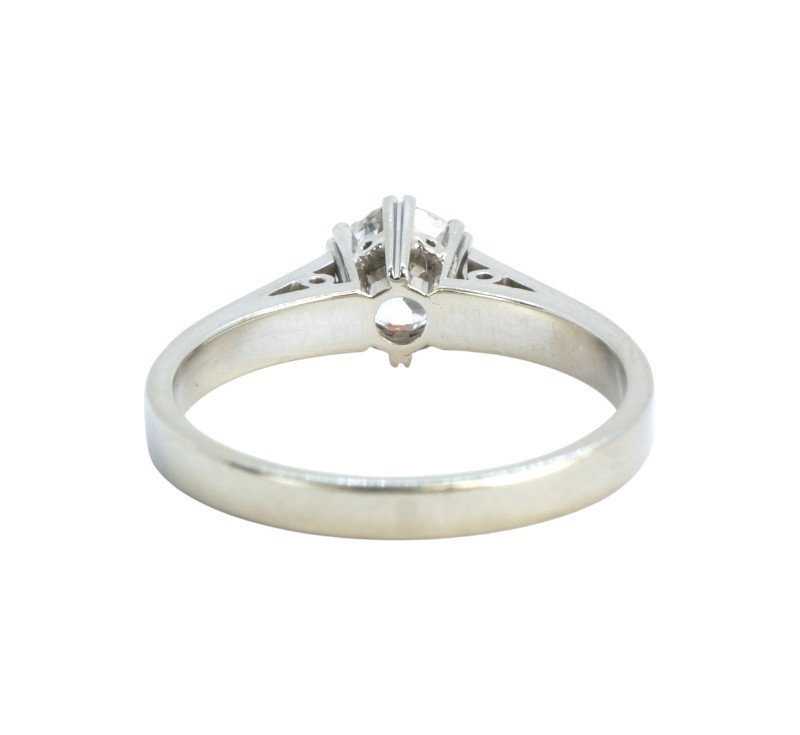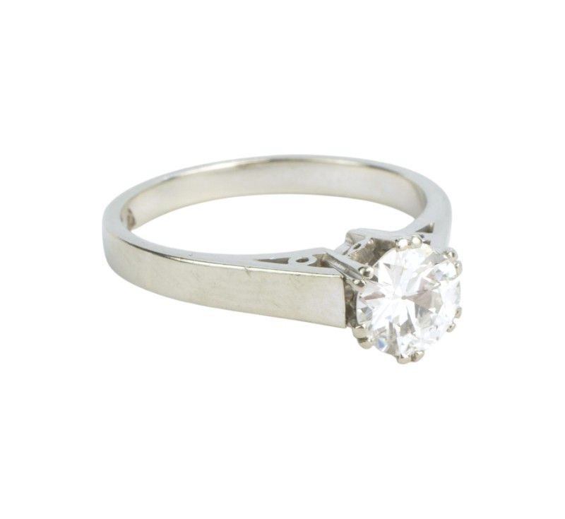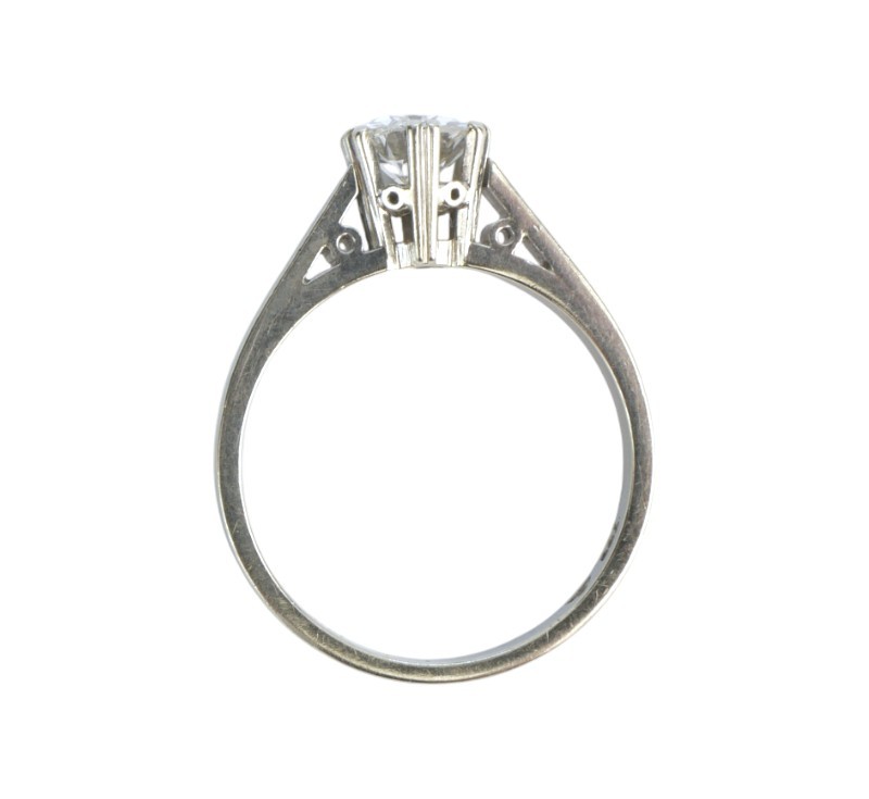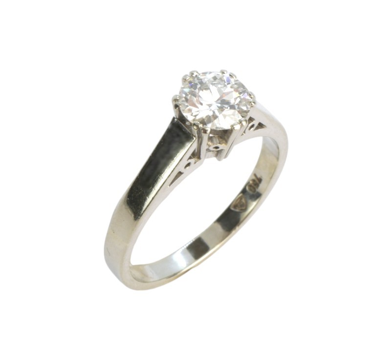 Prsten z bílého zlata je osazený velmi kvalitním solitérním přírodním diamantem kulatého briliantového brusu 0,77 ct, čistoty Vs1, vzácně bílé barvy barvy G. Zlato o ryzosti 18 karátů 750/1000 o celkové hmotnosti 3,80 g, velikost prstenu 55 (velikost lze na přání upravit). Vhodné jako velmi kvalitní zásnubní prsten. Atest Puncovního úřadu, Znalecký posudek.