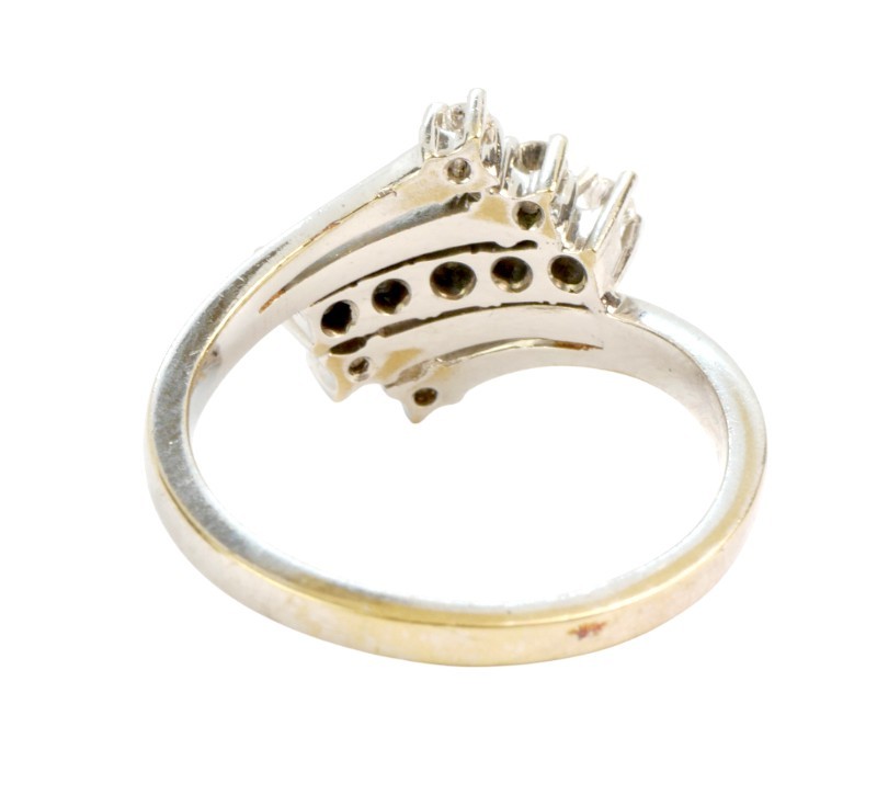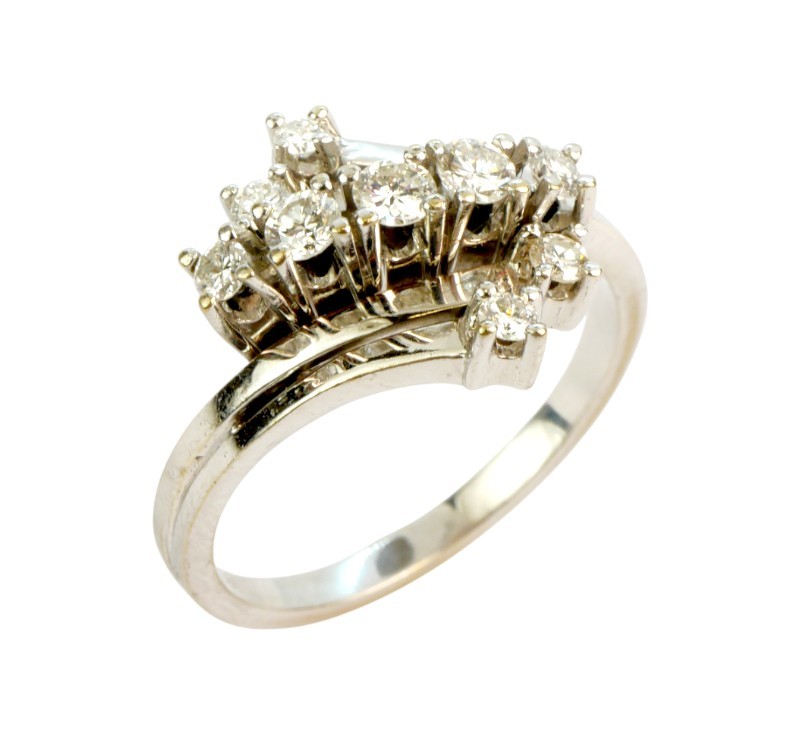 Moderní prsten z bílého zlata je osazený přírodními diamanty briliantového brusu o celkové hmotnosti 0,58 ct. Au 585/1000, celková hmotnost 5,20 g. Atest Puncovního úřadu. Velikost prstenu 60.