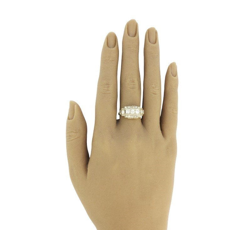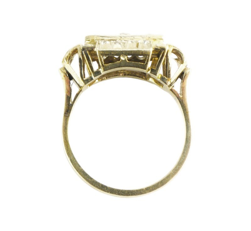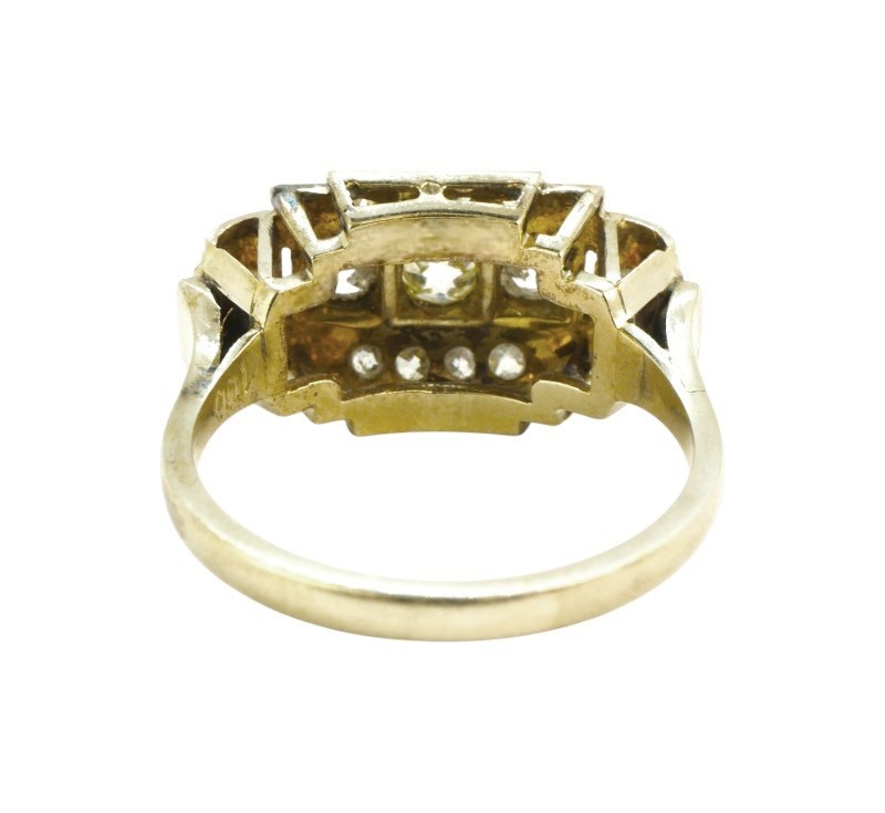 Prsten typický pro období art deco byl zhotoven z bílého (lehounce nažloutlého) zlata ryzosti 585/1000. V široké hlavě jsou zasazeny diamanty briliantového brusu celkové hmotnosti cca 0,55 ct. Velikost prstenu je 55, celková hmotnost 4,88 g.