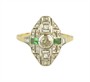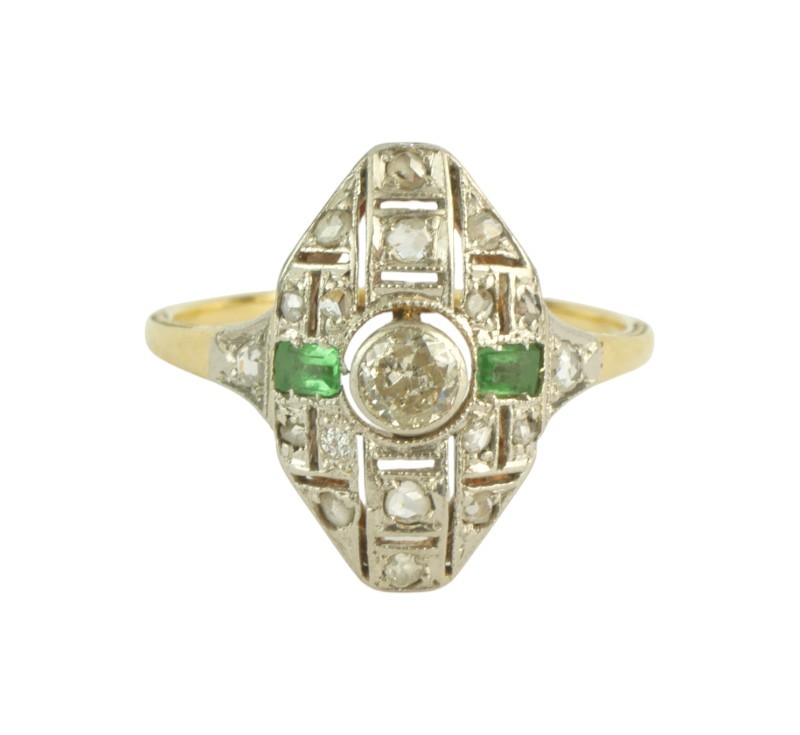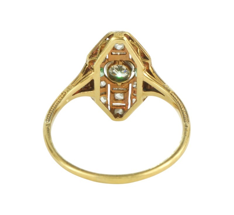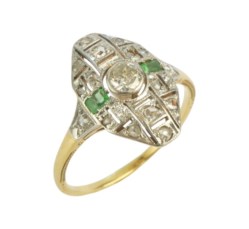 Starožitný zlatý prsten je osazený přírodním diamantem briliantového brusu 0,15 ct a diamantovými routami, zlato o ryzosti 585/1000 o celkové hmotnosti 2,75 g, velikost prstenu 58, rozměry hlavy prstenu: 1,8 x 1,1 cm. Atest Puncovního úřadu.