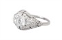 Briliantový prsten 1,45 ct Starožitný platinový prsten je osazený dvěma solitérními diamanty starého briliantového brusu 0,98 ct čistoty VS2 a barvy RW (vzácně bílá ) a W (bílá ) a dalšími brilianty o hmotnosti 0,47 ct velmi dobré kvality 20. léta 20. století, období Art Deco, platina o ryzosti 950/1000 o celkové hmotnosti 3,85 ct, velikost prstenu 50 ( velikost lze na přání upravit ) Atest Puncovního úřadu, Znalecký posudek o pravosti kamenů přiložen