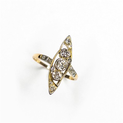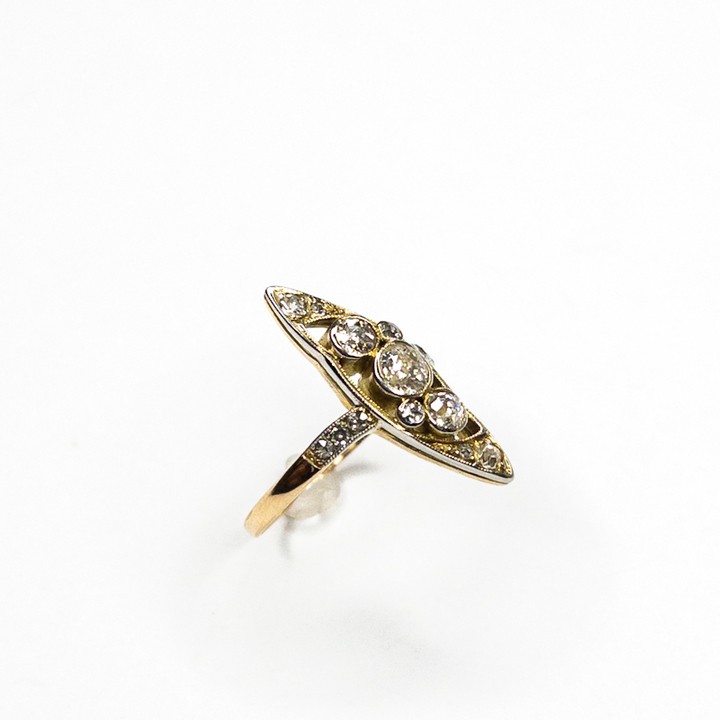 Starožitný zlatý prsten s přírodními diamanty briliantového brusu 0,61 Ct, zlato o ryzosti 14 karátů 585/1000 o celkové hmotnosti 2,72 g, velikost prstenu: 54, rozměry hlavy prstenu: 2,3 x 0,6 cm, znalecký posudek o pravosti kamenů přiložen