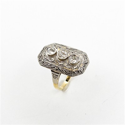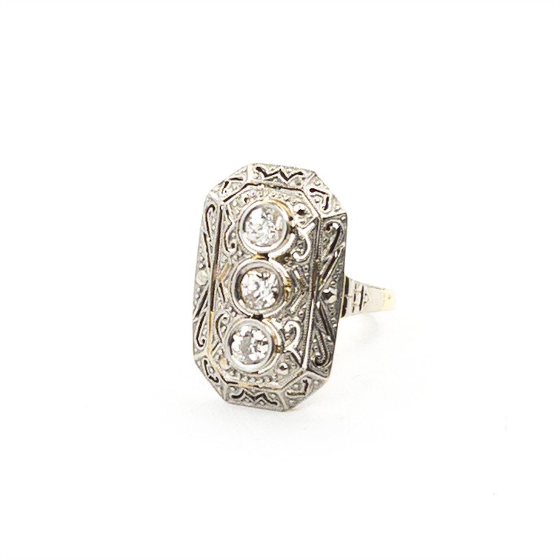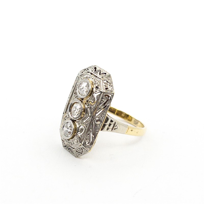 Elegantní, původní prsten z dvacátých let dvacátého století je osazen třemi přírodními diamanty starého briliantového brusu o celkové hmotnosti 0,48 ct, hlava prstenu je výrazně zdobena prořezáváním, zlato o ryzosti 14 karátů 585/1000 o celkové hmotnosti 2,7 g, velikost prstenu 50 Znalecký posudek, Atest Puncovního úřadu, rozměry hlavy prstenu: 2,2 x 1,2 cm