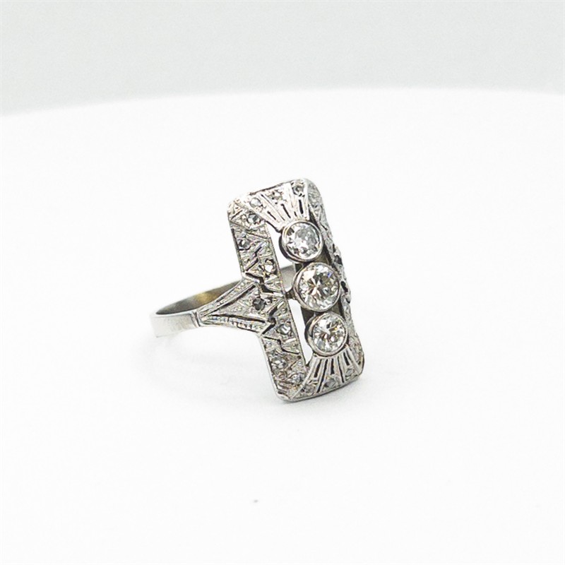 Výrazný starožitný zlatý prsten je osazen třemi přírodními diamanty starého briliantového brusu 0,55 ct, 20. léta 20. století, období Art Deco bílé zlato o ryzosti 14 karátů 585/1000 o celkové hmotnosti 4,66 g, velikost prstenu: 55, rozměry hlavy prstenu: 2 x 1 cm, Atest Puncovního úřadu