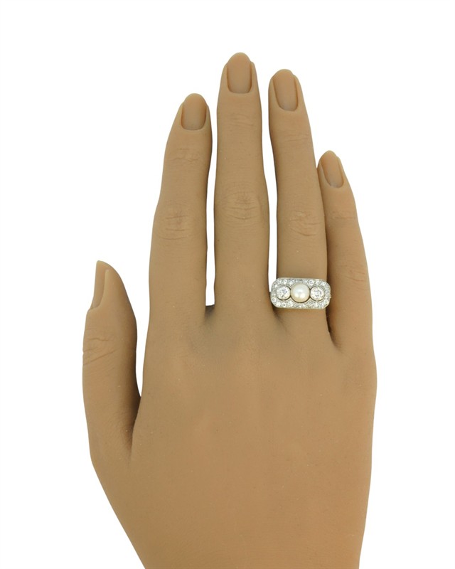Briliantový prsten s jihomořskou perlou, 20. léta 20. století, období Art Deco, prsten je osazen jednou jihomořskou perlou a přírodními diamanty starého briliantového brusu o celkové hmotnosti 1,28 ct dobré kvality VV-SI, kameny jsou zasazeny v platině, zlato o ryzosti 18 karátů 750/1000/3,95 g, velikost prstenu 52.