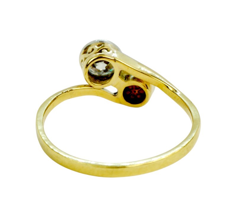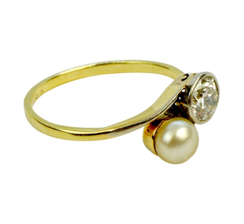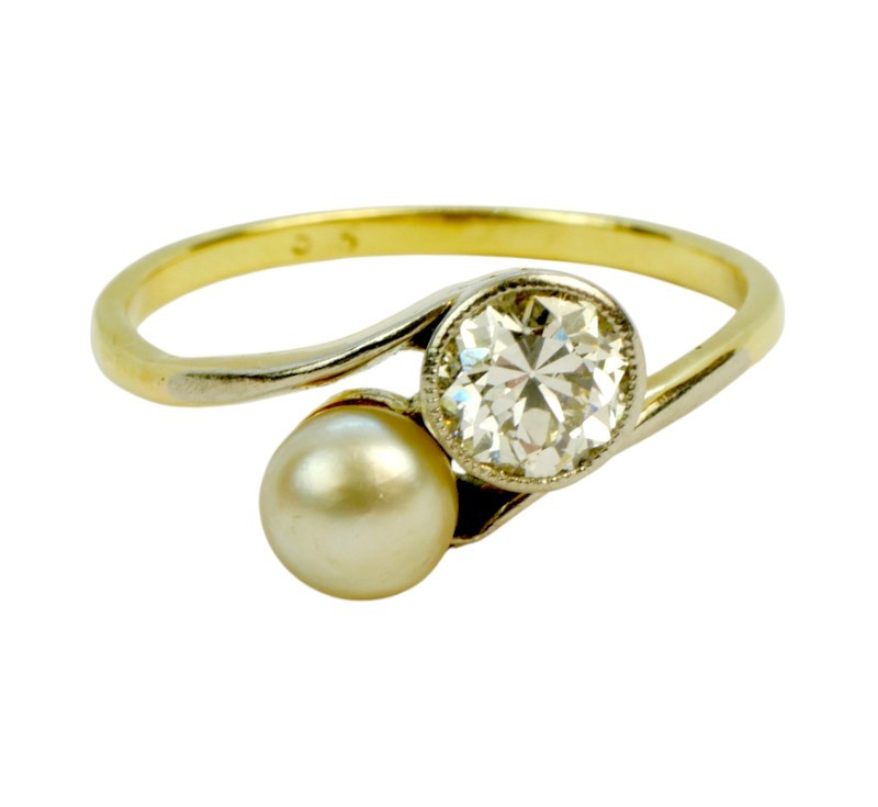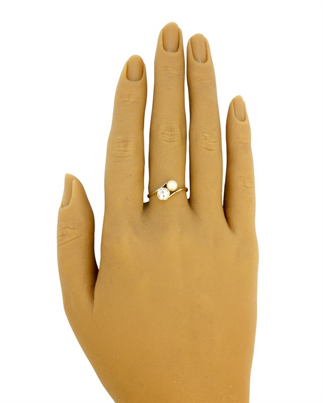 Zlatý prsten osazený přírodním diamantem starého briliantového brusu 0,60 ct a perlou. Zlato o ryzosti 14 karátů 585/1000 o celkové hmotnosti 2,1 g, velikost prstenu 53,5.