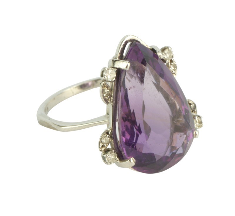 Zlatý prsten s přírodním ametystem 12 ct a brilianty 0,12 ct, centrální kámen byl ověřen jako přírodní ametyst o váze 12 karátů, kapkového portugalského brusu. Au 350/1000 o celkové hmotnosti 5,40 g. Velikost prstenu 56, rozměry hlavy prstenu 2 x 1,5 cm.