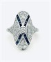 briliantový prsten se safíry ve stylu Art Deco ,zlato o ryzosti18 karátů 750/1000, hmotnost 5,00g, velikost 54, diamanty o celkové váze cca 0,97ct., a safírové bagety, vynikající zlatnická práce Československo, platný punc