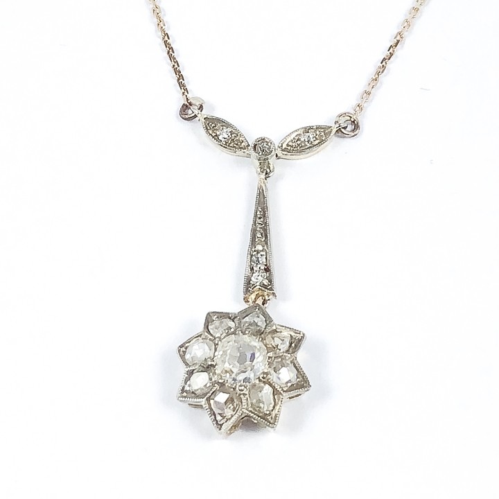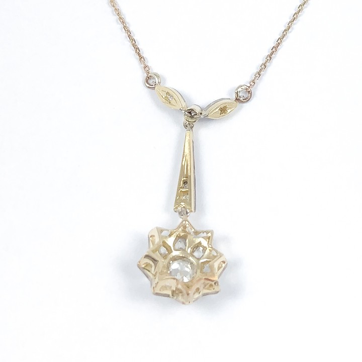 Luxusní zlatý náhrdelník s přírodními diamanty 0,52 ct, jedná se o původní originální šperk ( nikoliv o novodobou repliku ) zlato o ryzosti 585,580,400/1000 o celkové hmotnosti 3,10 g, horní část závěsu s kameny zasazena ve stříbře, Atest Puncovního úřadu, Znalecký posudek o pravosti kamenů přiložen délka řetízku: 41 cm, rozměry závěsu: 3,2 x 1 cm