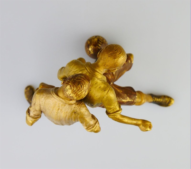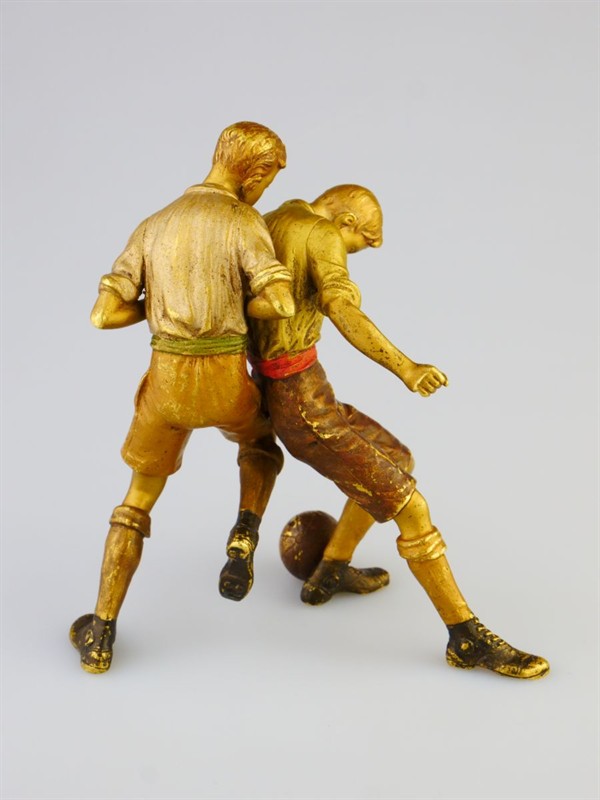 sousoší dvou fotbalistů zápolících o míč, kolorovaný bronz, detailně propracovaná dvoufigura vídeňské firmy F. X. Bergmannn, Rakousko, kolem r. 1920, značeno; rozměry 11 x 10,3 cm; sběratelsky zajímavé