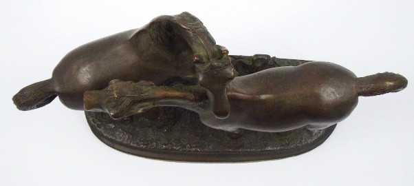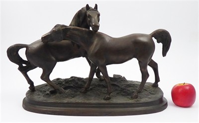 Patinovaný bronz. Nesignováno. Sousoší z patinovaného bronzu zachycující blízkost dvou koní pasoucích se na louce. Na oválné stylizované plintě reliéfně zachycující traviny i luční květy. Velmi působivé bronzové sousoší je rozměrné a těžké. Československo 1920 - 1940. Výška 33 cm, šířka 52 cm, hloubka 20 cm a rozměr podstavce 48 cm x 20 cm.