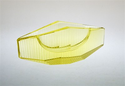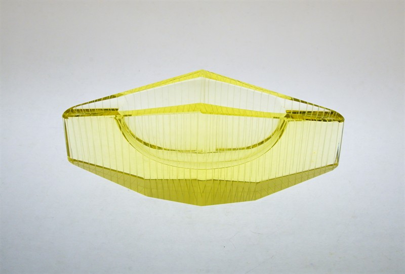 Celoplošně brusem zušlechtěný popelník v krásném barevném odstínu Citrín, který je dekorovaný broušeným lineárním ornamentem. Popelník je z kolekce, která získala čestné uznání na světové výstavě EXPO´58 v Bruselu a úspěšně se prezentovala v roce 1960 na XII. Triennale Milano. Autorem je sklářský výtvarník, pedagog, brusič a rytec - Václav PLÁTEK (*1917 +1994), žák prof. K. Štipla a F. Kysely. Provedení Jablonecké sklárny závod Dolní Polubný. Dobrý stav, rozměry - š. 20 x 8 x 6,5cm